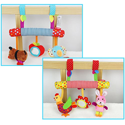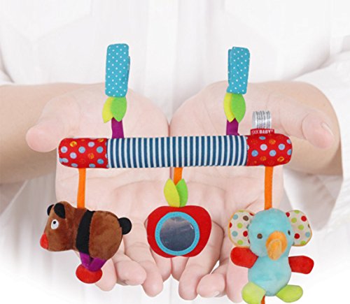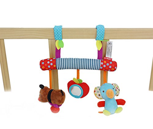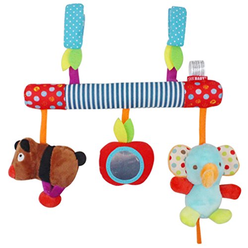 Package included: 1*toy(brown dog & apple mirror& blue elephant). Three plush pals invite baby to reach, grab and play.