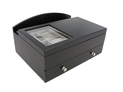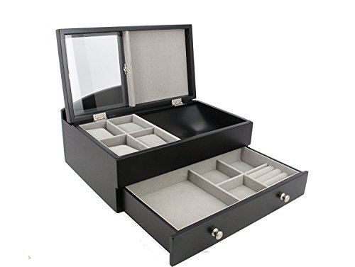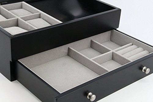 Features a pull-out drawer with 4 small sized ring cushions and 3 small compartments for small jewelry such as earrings, and small bracelets, 1 compartment sized 5.5 x 5.5 x 1 inch for medium sized jewelry such as necklaces, and two back vertical compartments to store extra documents or your smartphone