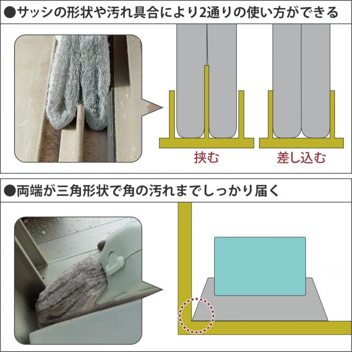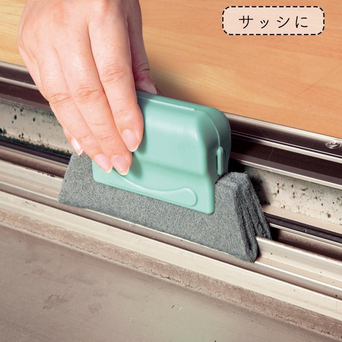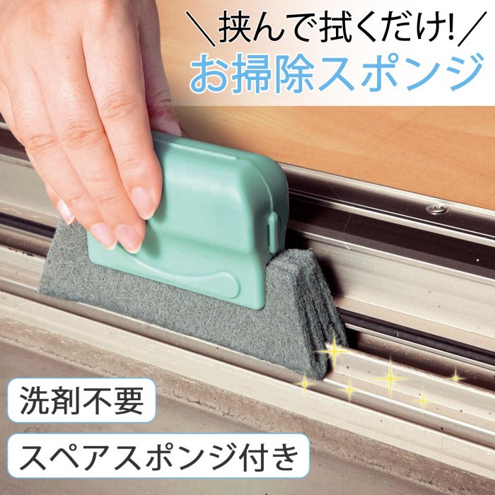サッシのお掃除がラクラク!挟んでこするだけのお掃除スポンジ。サッシの形状や汚れ具合により「挟む」「差し込む」2通りの使い方ができます。両端が三角形状なので角の汚れまでしっかり届きます。使用方法もカンタン。スポンジに水を含ませるだけで洗剤不要です。付け替え用スペアスポンジ1組付き。サッシやエアコン、ブラインドのお掃除に。挟んで拭くだけ!お掃除スポンジ。 |