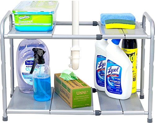 Studio : Simple Houseware Publisher : Simple Houseware Product Description SimpleHouseware Under Sink 2 Tier Expandable Shelf Organizer, Silver. To save your under sink space in kitchen , bathroom. Born to under sink space (kitchen/bathroom), varied configuration allow you get stuff organized around the pipes under the sink . Expandable Rail length from 15' to 25' . Adjustable tier height allow you configure two tiers at different four levels: 2, 5.5, 9, 13 inches from bottm. . Beautiful Perforated Steel Panel is sturdy and hold very well. Include 3 large panels (6-3/8') and 4 small panels (3-1/8')