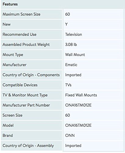 -. Binding : Electronics -. Brand : ONN -. Color : Black -. EAN : 0681131134460 -. Feature : Fits 19" to 60" flat panel TVs / Bonus 6' HDMI 2.0 cable included / Solid, heavy-gauge steel construction with durable product coated finish / Supports up to 77 lbs / Low profile design mounts your TV just .79" from the wall -. Label : China -. LegalDisclaimer : While we aim to provide accurate product information, it is provided by manufacturers, suppliers and others, and has not been verified by us. -. Manufacturer : China -. Model : ONA16TM012E -. MPN : ONA16TM012E -. PackageQuantity : 1 -. PartNumber : ONA16TM012E -. ProductGroup : Speakers -. ProductTypeName : AV_FURNITURE -. Publisher : China -. Studio : China -. Title : Low Profile Universal Wall Mount for 19"to 60" TV With HDMI Cable -. UPC : 681131134460