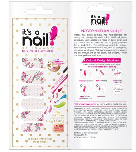 THE PERFECT MANICURE IN MINUTES! Incoco has revolutionized nail beauty by creating the world's first 100% real nail polish appliques! Each applique is made of a base, color and top coat of real nail polish. These appliques are flexible and can be gently stretched to easily fit any nail size and shape. The result is a brilliant, salon-quality manicure in minutes with no dry time, smudges or streaks.Feature