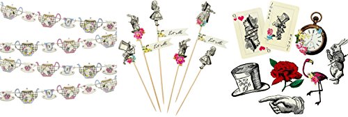 -. Feature : Party set includes: 1 Teapot garland, 12 Food picks, and 8 XL Props / 4 metres of bunting & 16 pennants in 8 curious designs. / Quirky food decorations feature 4 different Alice in Wonderland illustrations and come in packs of 12. / Featuring 8 XL props including a pointing finger, The White Rabbit, pocket watch, flamingo, mad hatter joker card, top hat, rose & Queen of Hearts playing card. / Great for birthday parties, tea parties, bridal and bunch, etc...