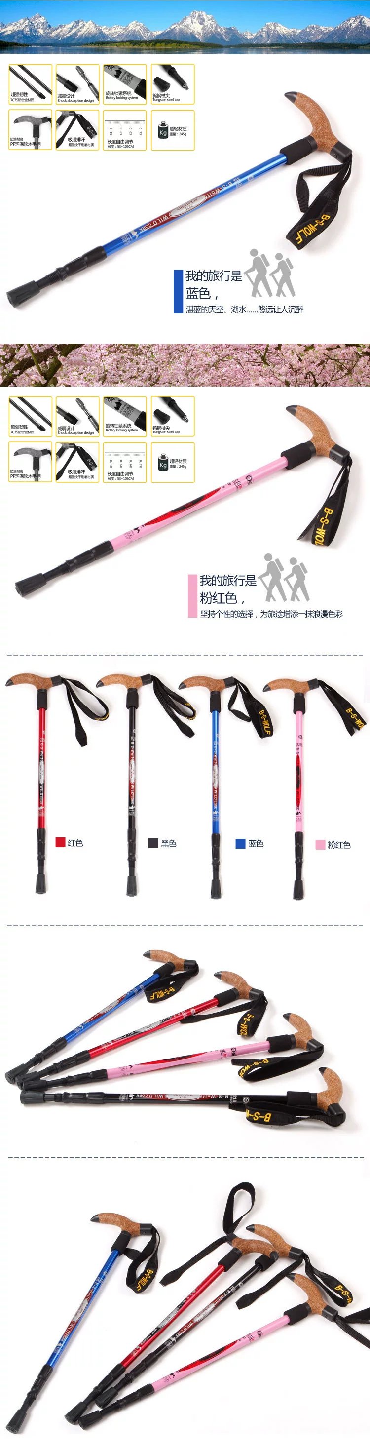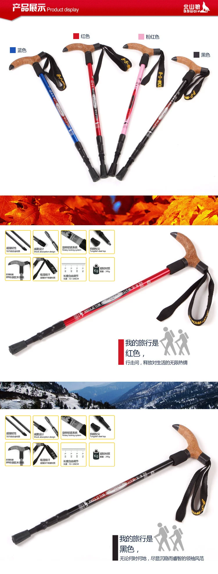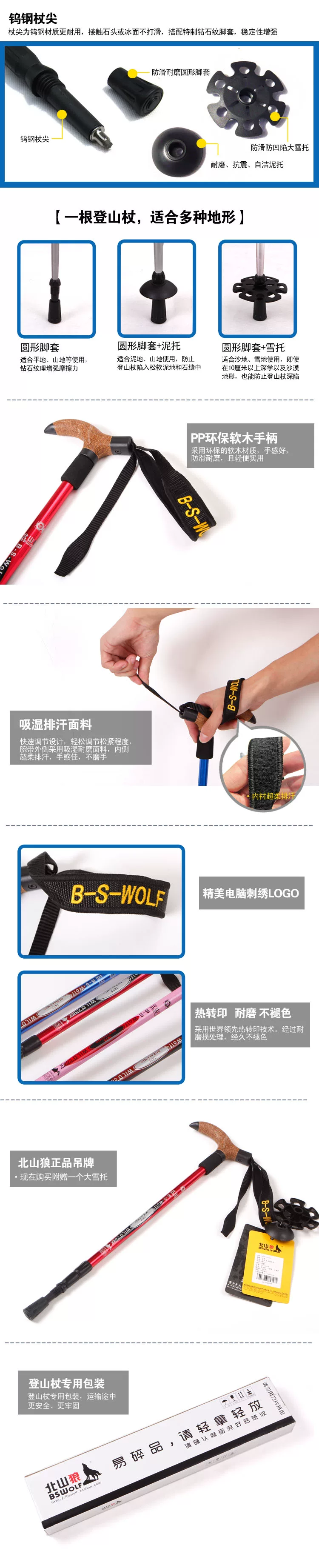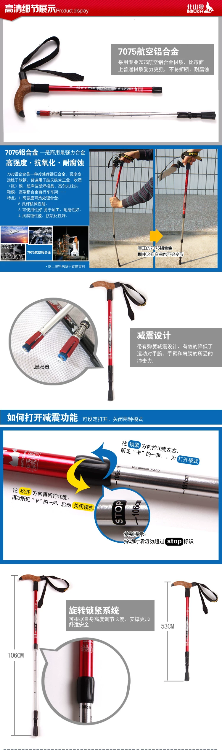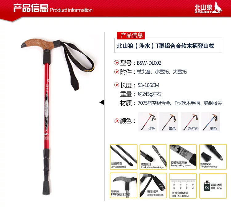 北山狼户外超轻弯柄登山杖7075手杖T型徒步拐杖手杖超轻老人杖