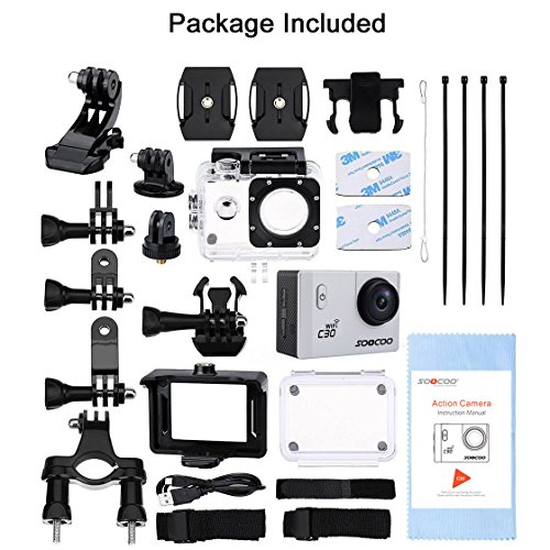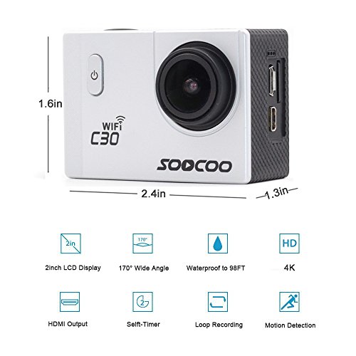 Sports Camera, SOOCOO C30 4K Action Camera 20MP 2.0 Inch Waterproof Diving Camera with 2 Batteries and 18 Accessories Kit Included - Silver + Wifi (Micro SD Card Not Included)