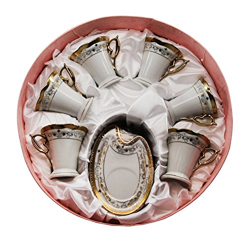 -. Brand : Royal Porcelain -. Color : Gold, White -. EAN : 0791810910633 -. Feature : Six 4-Ounce Cups and Six Saucers / 12-piece Miniature Coffee Set / 24K Gold-Plated, Elegant Design / Sold in Beauriful Solid Pink Round Shape Gift-Box / Makes a unique and sophisticated gift -. Label : Royal Porcelain -. Manufacturer : Royal Porcelain -. ProductGroup : Kitchen -. ProductTypeName : KITCHEN -. Publisher : Royal Porcelain -. Studio : Royal Porcelain -. Title : Royal Porcelain 12pc White & Gold Miniature Coffee Set, 6 Gold-Plated Cups w/ Saucers, High Quality Porcelain -. UPC : 791810910633