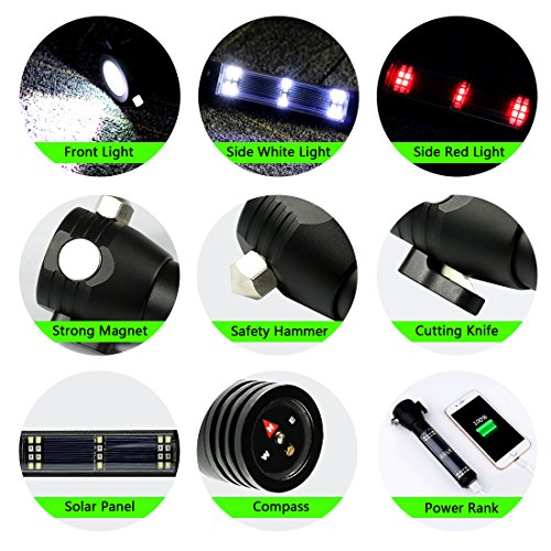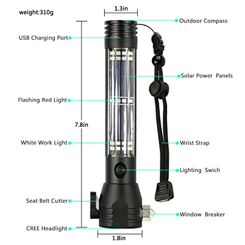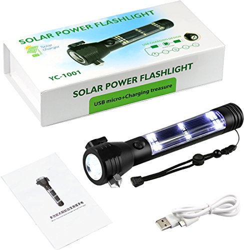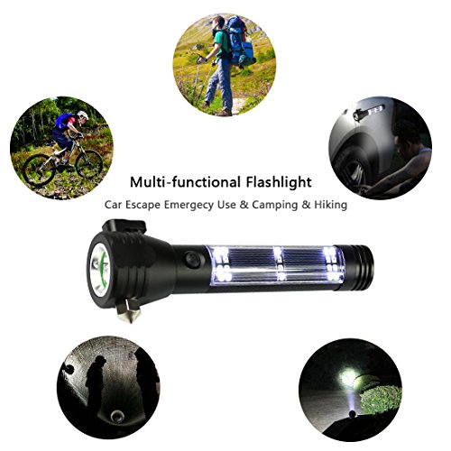 LED Flashlight,Yaufey Solar Power Flashlight & USB Rechargeable Multi-functional LED Flashlight,7 lighting modes,waterproof,with Car Emergency Tool, Attack Hammer,Cutting Knife,Magnet,Compass