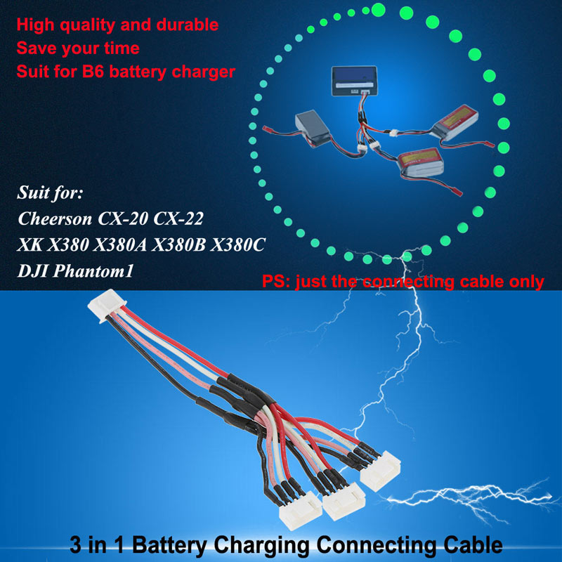 This 3 in 1 battery charging connecting cable can be applied for Cheerson CX-20 CX-22 XK X380 X380A X380B X380C DJI Phantom1 RC drone, which is very convenient and saves you lots of time.