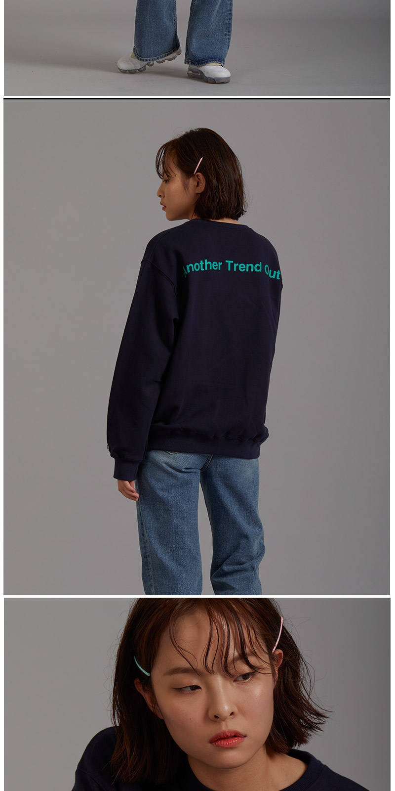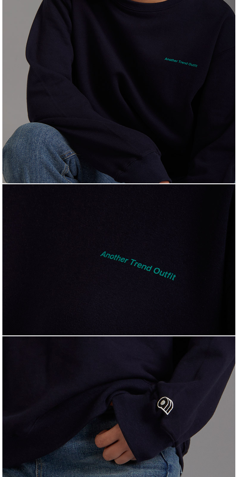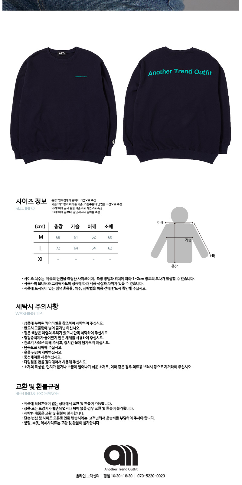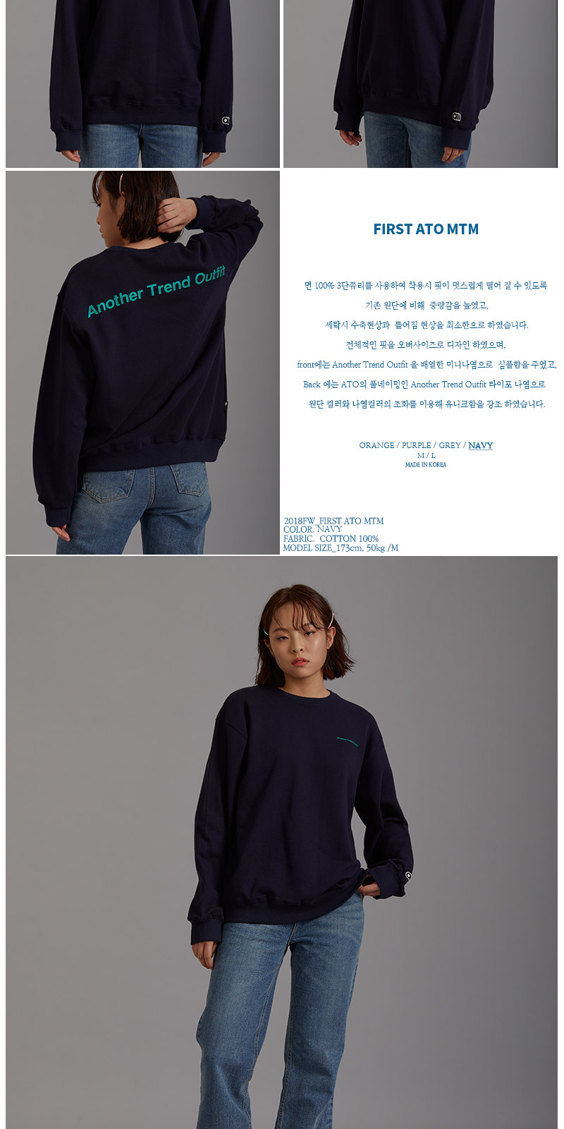| 면 100% 3단쮸리를 사용하여 착용시 핏이 멋스럽게 떨어 질 수 있도록 기존 원단에 비해 중량감을 높였고, 세탁시 수축현상과 틀어짐 현상을 최소한으로 하였습니다. 전체적인 핏을 오버사이즈로 디자인 하였으며, front에는 Another Trend Outfit 을 배열한 미니나염으로 심플함을 주었고, Back 에는 ATO의 풀네이밍인 Another Trend Outfit 타이포 나염으로 원단 컬러와 나염컬러의 조화를 이용해 유니크함을 강조 하였습니다. |