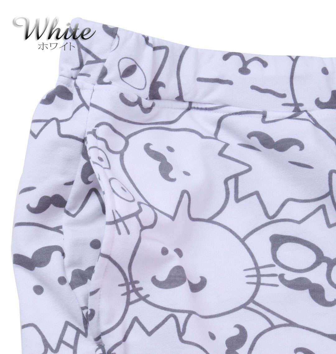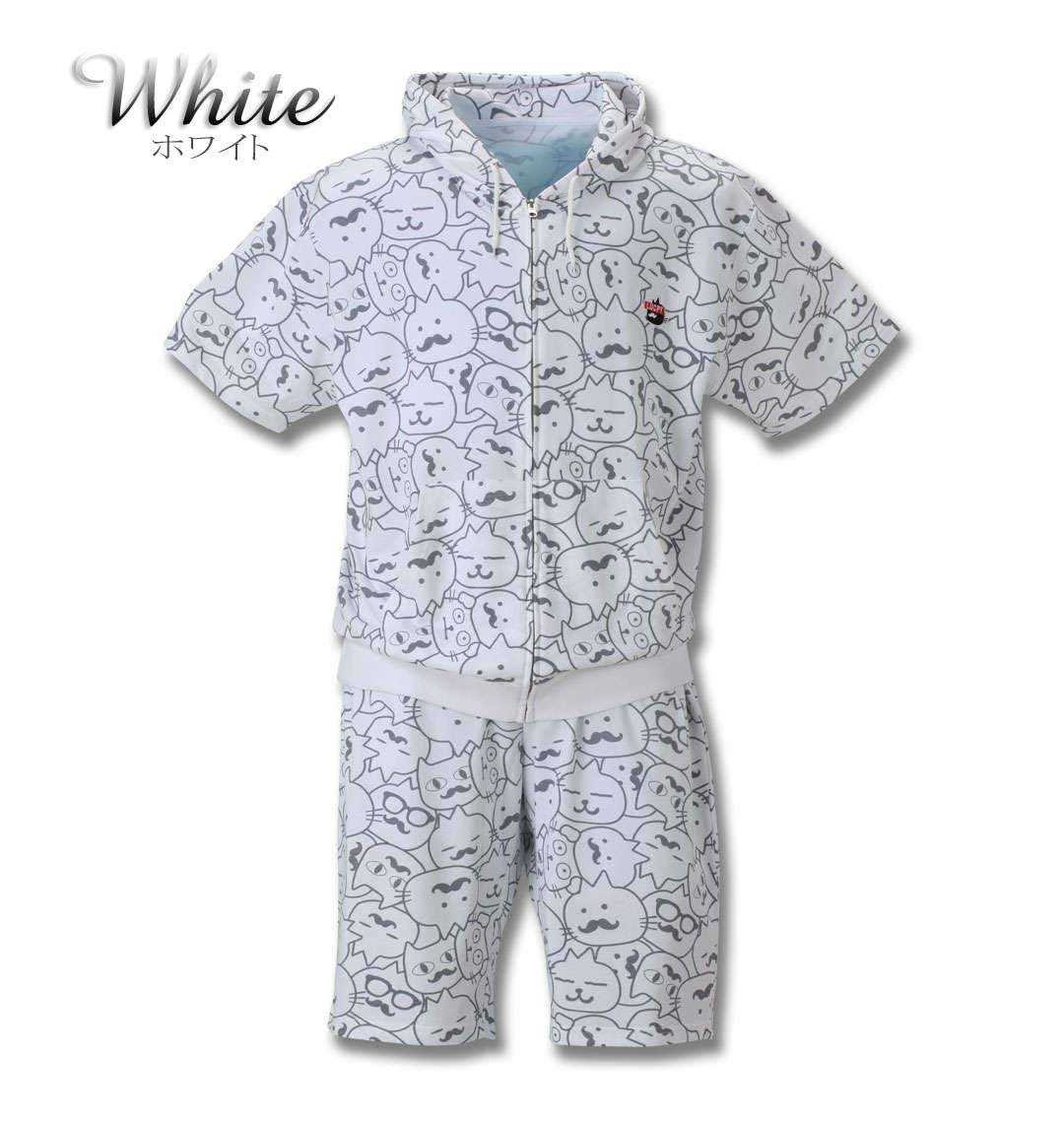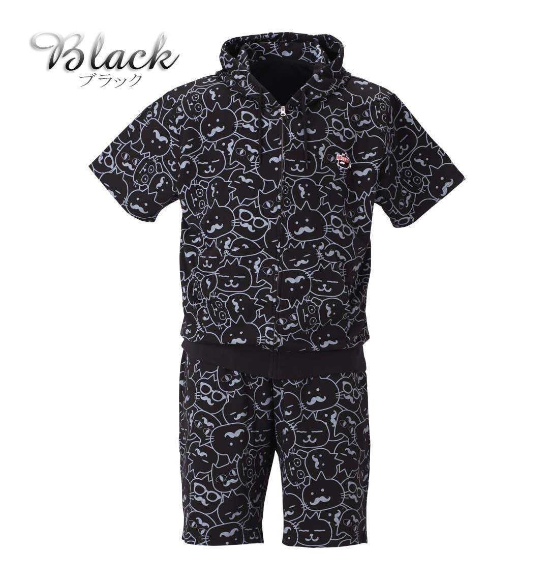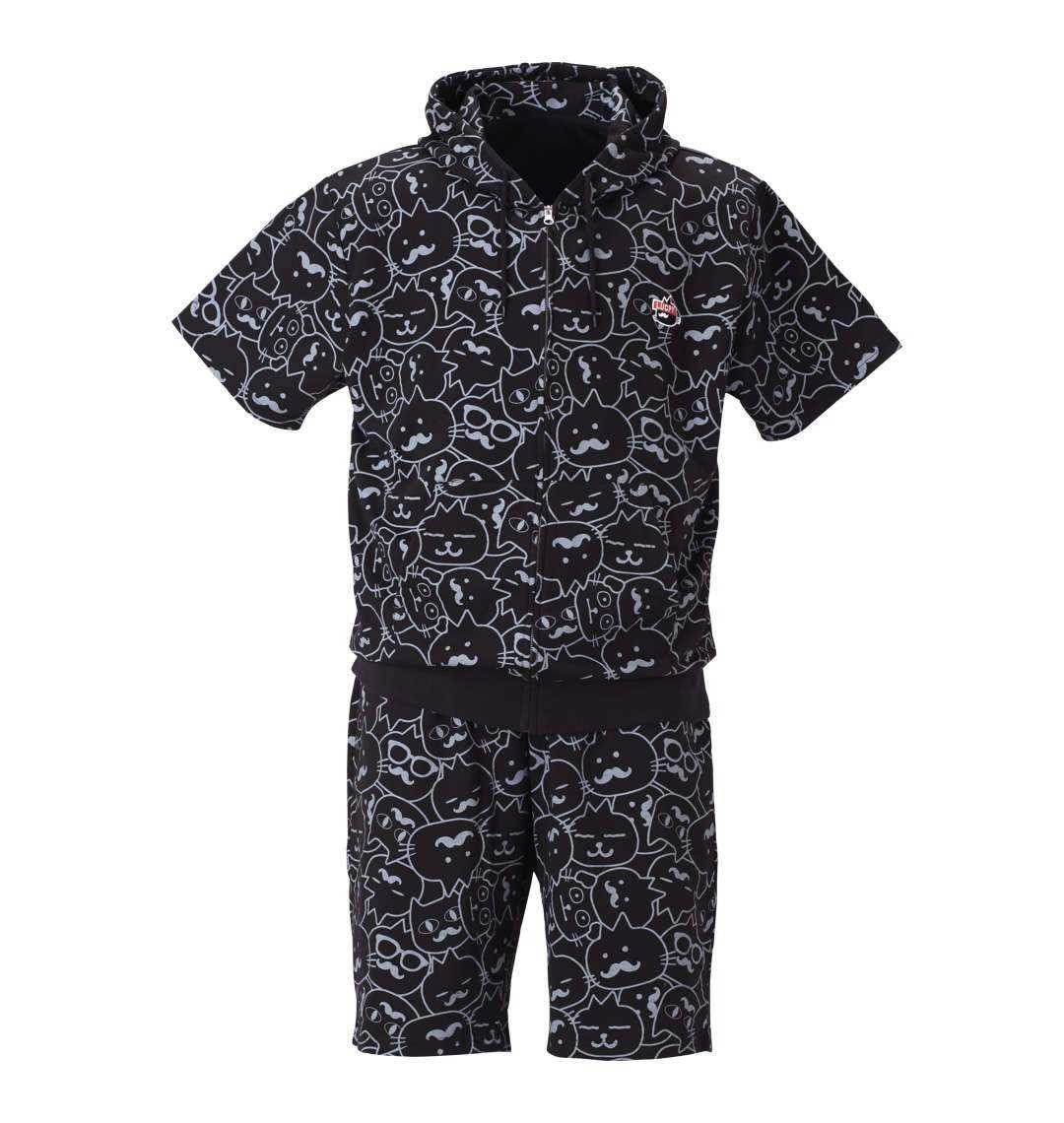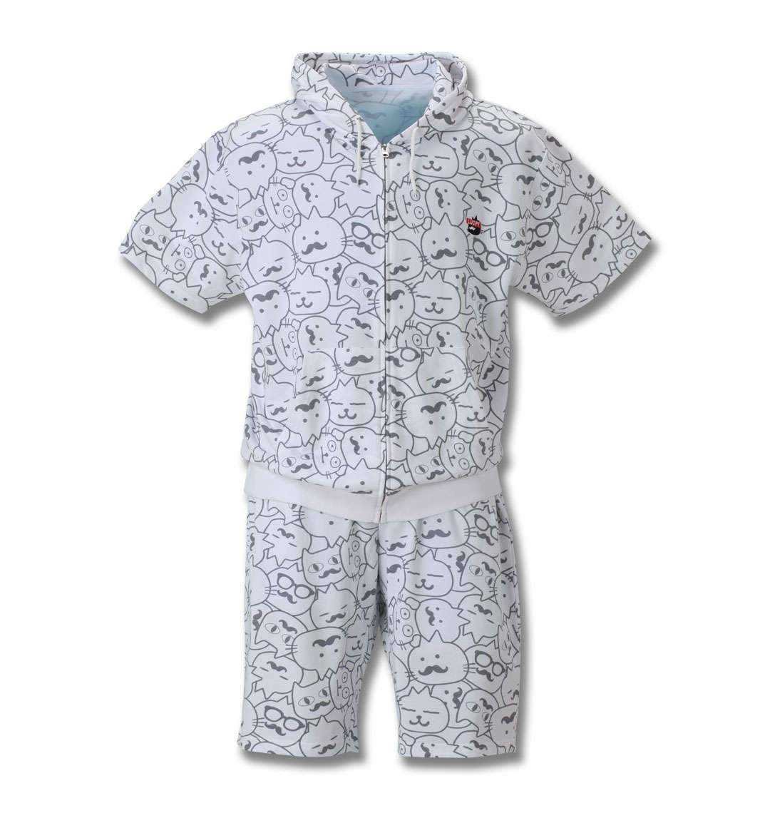 愉快なラクピーフェイスの総柄が楽しい、半袖フルジップパーカーとハーフパンツの上下セット。