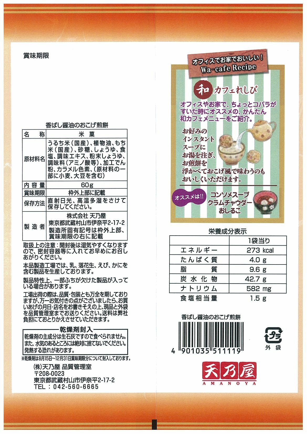 Per bag (60 g), energy: 273 kcal, protein: 4.0 g, lipid: 9.6 g, carbohydrate: 42.7 g, sodium: 582 mg