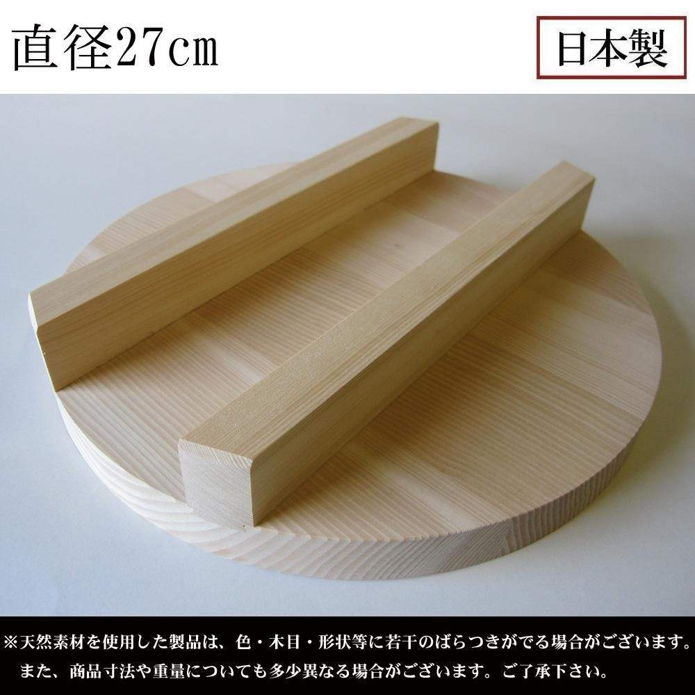 業務用のどっしりとした釡蓋です。取手の部分に釘や接着剤を使用していないので、安心してお使いいただけます。 製造国:日本 素材・材質:北米産スプルース材 商品サイズ:Φ27×全高7.2cm、蓋厚み:3cm 重量:約700g 仕様:食洗機使用不可 付属品:取扱説明書 ※サプライヤー直送品 ご注文後9~12営業日後の出荷となります【商品名】市原木工所 日本製 業務用 釜蓋 落し蓋 直径27cm 24325