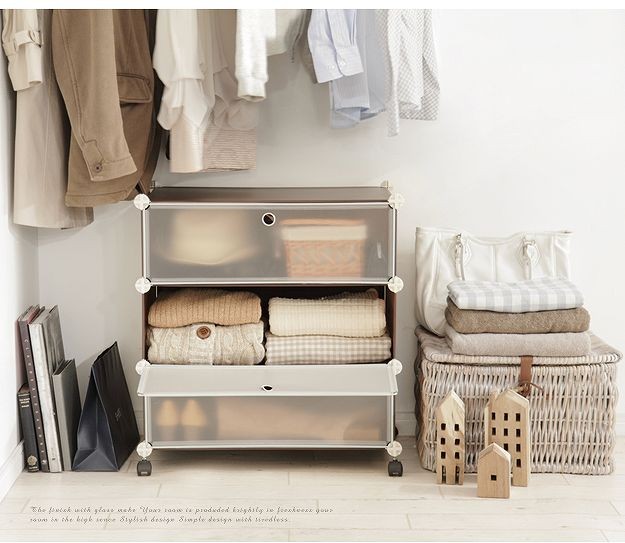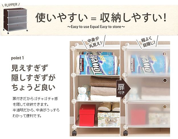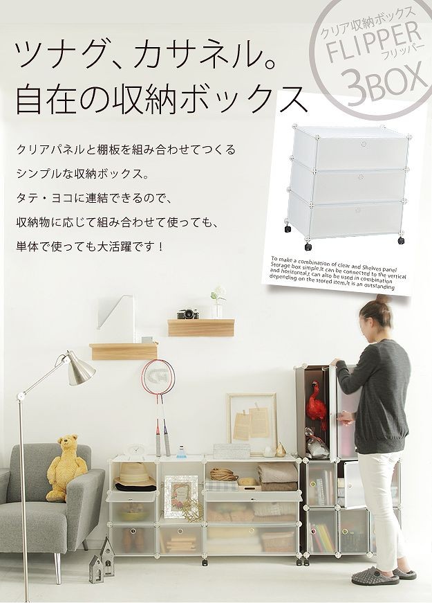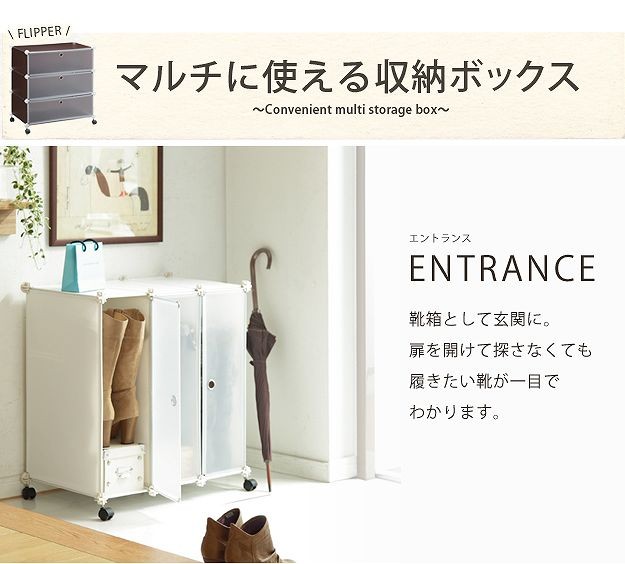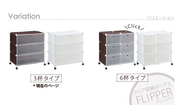キャスター付きのクリア収納ボックス3杯。扉は収納物がわかり易い半透明。クローゼット内でのシューズやバックの収納にも便利です。複数ご購入の場合、付属の連結金具でタテにもヨコにも自在に組み合わせができます。