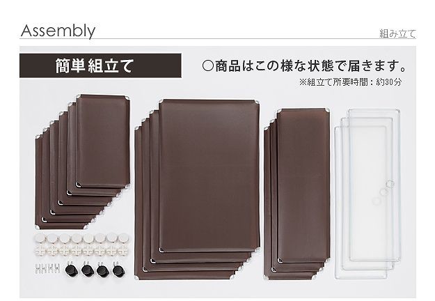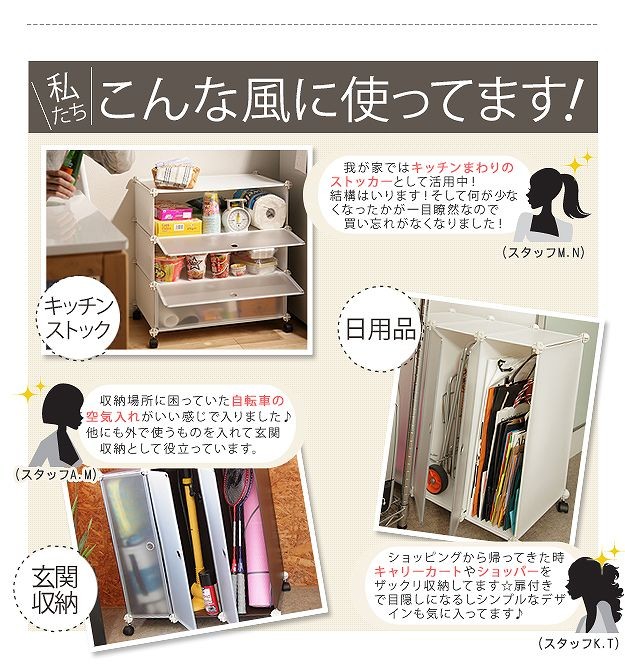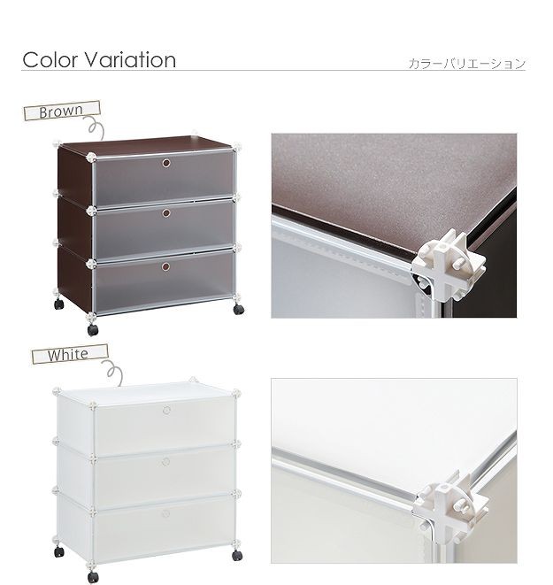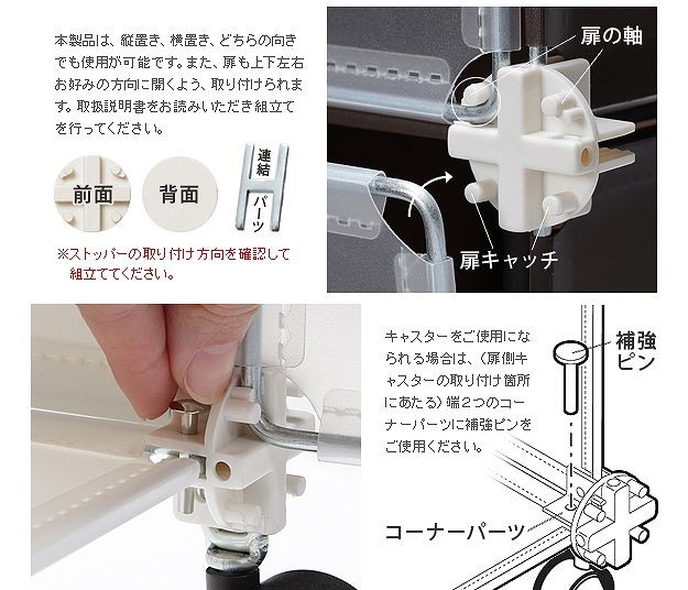 材質:本体枠-スチール、本体・扉-ポリプロピレン樹脂(※扉は半透明)、ジョイントパーツ-ABS樹脂、キャスター-合成樹脂
