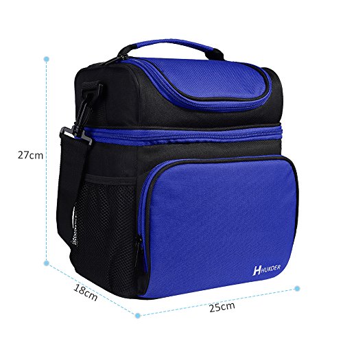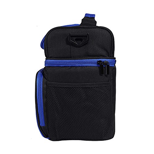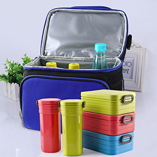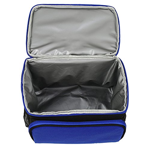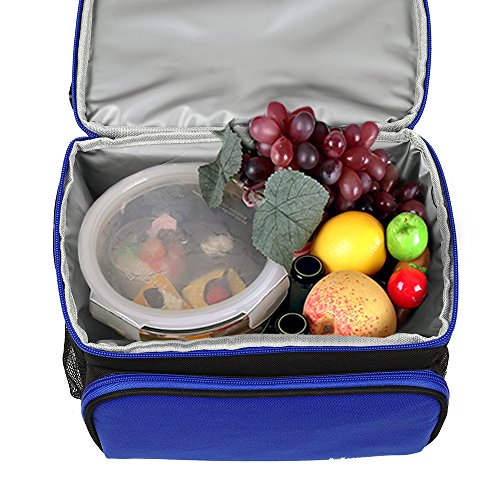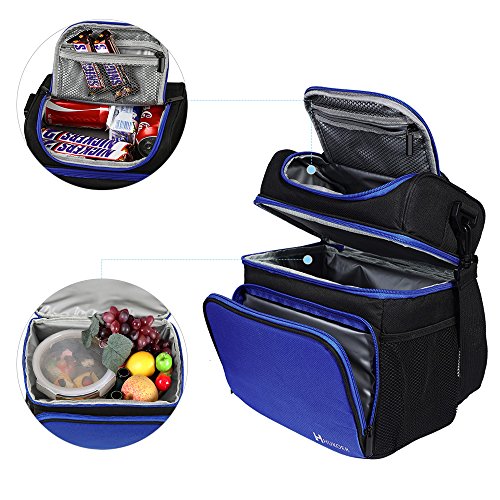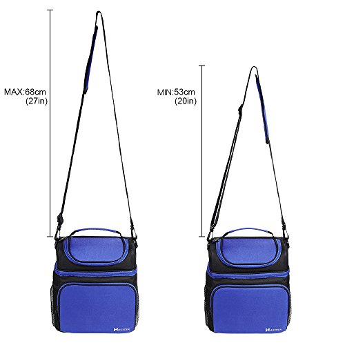 -. Feature : Reusable lunch bag with a soft detachable handle strap for easily carry. Upper compartment easy to access through front opening with a 2-way dual zipper closure / Lunch bag with Two sections that keep cold and warm items separated. On top, a roomy pouch is great for chips, fruit, drinks snacks and cookies. Square bottom compartment used to carry your lunch, sandwich, salad and etc .Also two side pockets for additional needs. / Insulated Lunch Bag Made with highly durable 600D Polyester, 5mm PE foam padding and the interior insulated PEVA lining is Eco-friendly and food safe, wipes clean easily. / This insulated Lunch Bag has an adjustable and detachable strap; It also has a top handle providing you multiple carriage options. / Lunch bag Designed with a deep and spacious interior, you have enough space for your lunches.even could contain the whole day food that you need.Insulated Lunch Bag is just the right size for your lunch needs. You will love the size and smart style!
