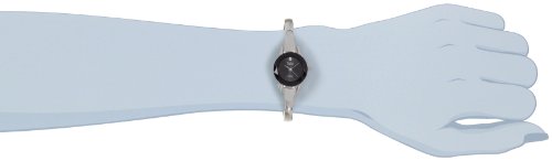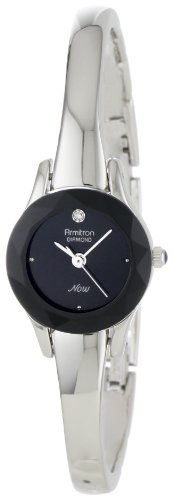 A sparkling, genuine diamond at 12 o'clock gives the Armitron Women's Diamond Accented Silver-Tone Bangle Dress Watch #752433BLK an understated glamour that suits its sleek, ultra-modern design. Appearing to suspend delicately above the wrist when its adjustable links are closed, this elegant timepiece has a round silver-tone case with blue cabochon crown, rich black dial with silver-tone hands and dot hour markers at three, six, and nine o'clock, and sweeping seconds hand. Reliable and precise thanks to Japanese quartz movement, this pretty and feminine timepiece arrives in a silver Armitron box.Feature