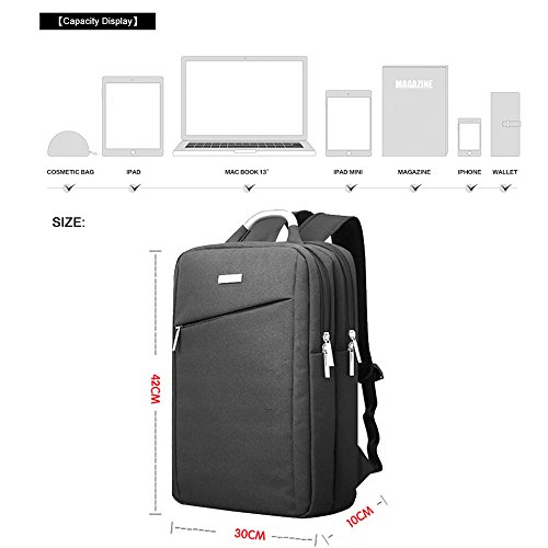 -. Feature : Measurements and Sizes: Exterior: 16" x 11" x5.5" Suitable for most popular 15.6 inches inch MacBooks / laptops / notebooks / Ultrabooks; may not snugly fit all computers due to variations in the sizes of different models. / Large multi-compartment backpack with a padded sleeve for laptops.Holds up to 15.6-inch notebook computer.Vourious pockets are ideal for storage of many small items such as phone, wallet, power adapters, cables,and notepads etc. offering added convenience / Compatible with: Display size up to 15.6-inch like: MacBook, Samsung, HP, Acer, ASUS, Lenove, Dell, Toshiba, Sony and others / Organizer Pocket; Padded Shoulder Straps.Airflow Backing System.Water Bottle Pocket / Airflow Back System: Multi-panel airflow design provides extra padding for comfort and maximum back support.Organizer Pocket: Interior organizer provides divider pockets for pens, pencils, cell phone and CD's