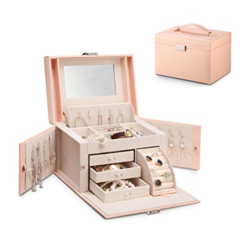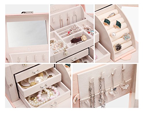 CONTAINS a built-in mirror, 13 earring hangers, 8 pairs of stud earring holders, 2 pouches in the side flaps, a row of ring rolls storing up to 18 rings, 3 drawers, and 3 compartments allowing you to store your whole jewelry collection.