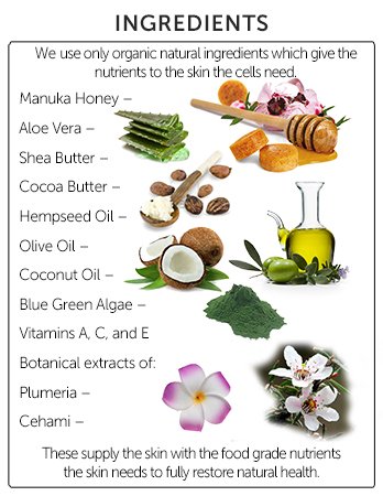 - Feature : • THE MAIN ingredient is a potent medical grade Aloe Barbadensis Gel. Aloe Vera naturally includes important vitamins such as A, C, B and E. It is also loaded with minerals such as zinc, calcium, magnesium and copper, plus essential enzymes. Aloe Vera's beneficial properties provide deep hydration, accelerated skin cell growth, and improved skin tone. / • WE INCORPORATE potent RAW MANUKA HONEY from New Zealand. This Honey was approved for medical use to heal untreatable wounds and infections. It has unmatched anti-bacterial, and beneficial skin healing qualities. It alone acts a powerful moisturizer, packed with a unique blend of vitamins, minerals and amino acids. / • ANOTHER SPECIAL component is an anti-aging Australian Botanical called Cehami. Cehami is 3 times more effective that aspirin in providing pain and itch relief and is scientifically proven to increase cell growth by up to 50%, resulting in firmer, healthier skin. / • THIS IS AN organic skin solution which was designed for the face, but due to its unique properties it is excellent anywhere on the body and won't wash off. In addition to the ultimate combination of ingredients above, this lotion is jammed packed with Blue Green Algae, Shea Butter, Cocoa Butter, and Olive Oil. It is soothing to even the most sensitive skin, and contains the most effective ingredients known in skin care and cellular regeneration. There are no allergens! / • EQUALLY IMPORTANT To understand is what we won't put in our products. We don't use water or mineral oil which are common in other products because they are a low cost filler (this is despite the fact that they will actually dry out your skin and irritate it). We also don't use alcohol, fragrance, harsh preservatives (parabens) or harmful chemicals. Your skin is like a sponge, and you only want healthy things going it! And of course, no animal testing.