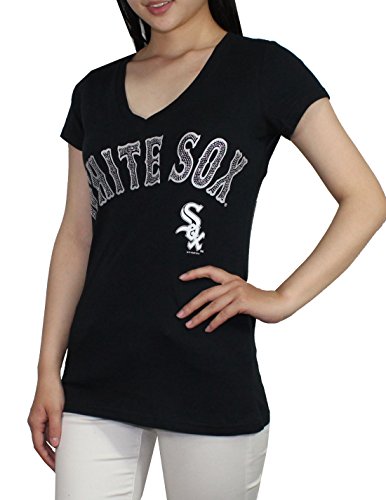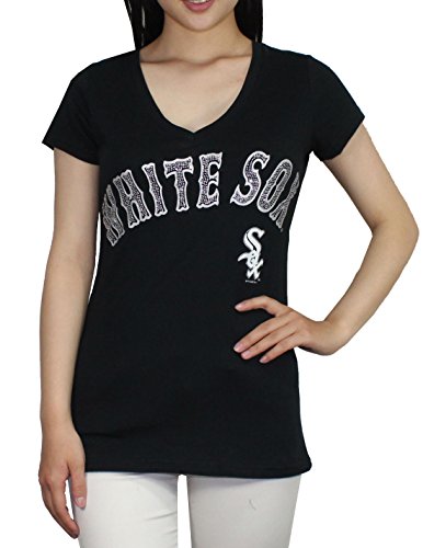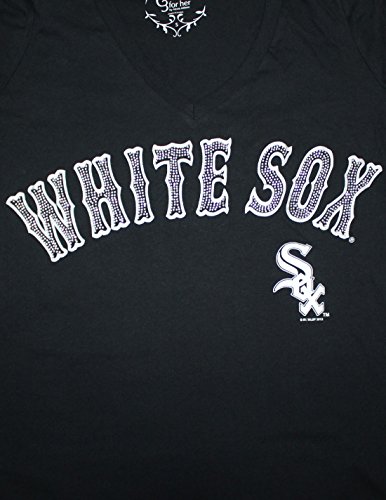 Womens CHICAGO WHITE SOX V-Neck Short Sleeve T Shirt with Rhinestones L Black