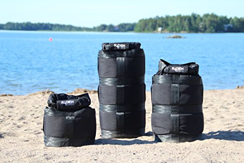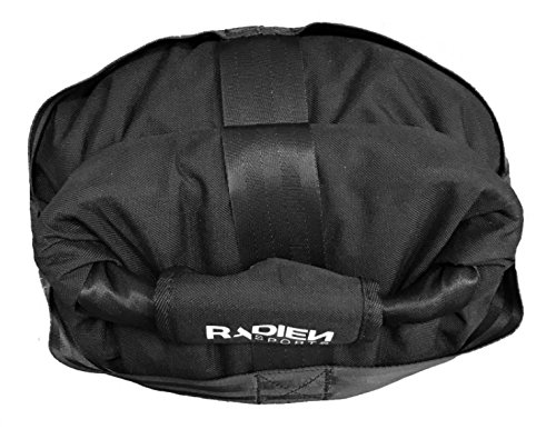 Versatile, durable, leakproof. These exclusive strongman sandbags measures 12"-16" in diameter 24" high when filled with sand. Comes with 3 padded, removable handle covers. (Sand not included.) Why pay more for a sandbag weight that holds less sand does less for you? Your Radien Sports Sandbags comes in 3 different sizes from holding 50 - 165 lbs. to 100 - 300 lbs., seals more securely handles a wider range of exercises... all at an affordable price. The Secret's Our Roll-Down Design Forget those leaky fitness sandbags that close with zippers, cords, or strings. This ingenious sandbag cinches just like a kayaker's drybag: Roll down the top till it's snug, then close the strong metal buckle. You'll have a leakproof seal in seconds - with no need for awkward filler bags. Best of All, It Adjusts for All Levels of Lifting Simply fine-tune how much sand you add how far down you fold the top: *Fill 1/3rd of the way to use as a kettlebell *Fill 2/3rds up to use as an Atlas Stone *Fill to capacity for serious loading events *Plus everything in between