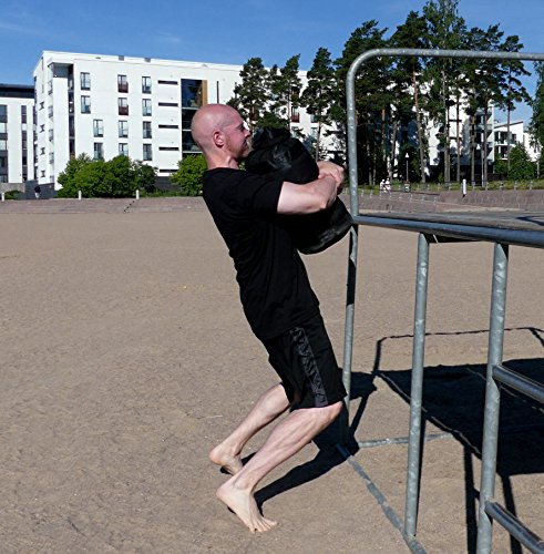 Built Tough for Years of Use Your gym--beach sandbag comes in 1000D nylon Cordura, reinforced with double-stitched seams. So, it'll stand up to the exercises above plus: Keg lift Sandbag carry Farmer's walk Squats: bag position shoulder/front sideways/vertical lap Deadlifts: sumo, stiff legged Rows Shoulder clean more