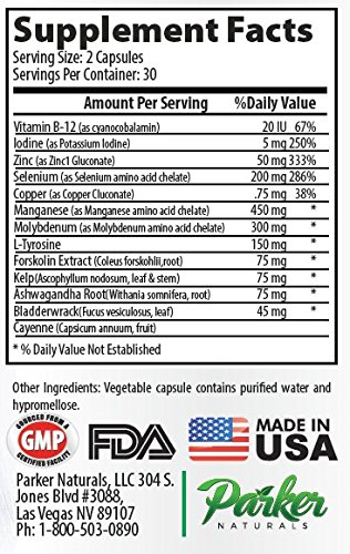 THYROID HEALTH Thyroid Support by Parker Naturals features a comprehensive array of vitamins and minerals to optimize your thyroid function and overall body wellness. Thyroid health is essential to the proper regulations of vital organs like the brain, heart, liver, kidneys, and skin. ENERGY BOOST Thyroid Support also packs an energy boosting roster of Vitamin B12, Iodine, Copper, and more to leverage your healthy diet and exercise regimen. With your metabolism operating in high gear, you'll burn fat more easily and have the energy you need to tackle your busy day and workout schedule. MENTAL FOCUS Poor thyroid health has a trickle-down effect, impeding the body's ability to function at its best and draining mental focus. Enhanced with brain-boosting elements like Copper, Forskolin and Zinc, our supplement will help your thyroid perform at peak capacity and allow full mental sharpness to come alive. ENHANCED WELLNESS With body balance restored, your health can flourish. Vitamin B12 and Copper boost hair, skin and nails, Selenium and Schizandra improve the immune system and lower inflammation, and Ashwagandha and Cayenne work to regulate blood sugar levels and blood circulation. HELPS WEIGHT LOSS Weight gain can be a symptom of a malfunctioning thyroid gland. Help steer your body's metabolism in the right direction with a potent mix of Iodine, Cayenne, Forskolin, Manganese and Molybdenum that not only regulate metabolic levels, but also aid growth of lean muscle mass and muscle strength to return maximum results at the gym. -Parker Naturals Thyroid Support -Supports Thyroid Function and Overall Wellness -Improves Energy, Metabolism, and Cognitive Focus -Includes Ashwagandha, Vitamin B12, Iodine, and Zinc -60 CapsulesFeature