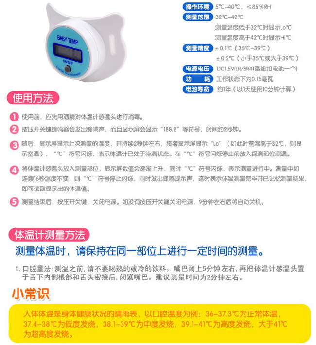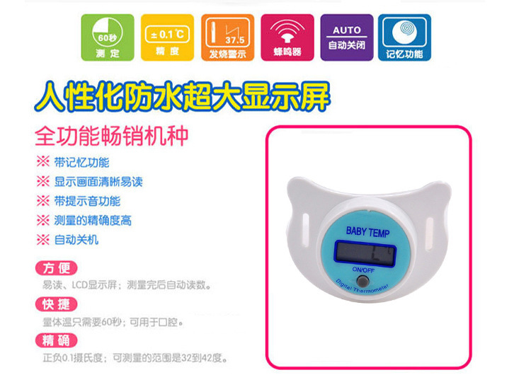Pacifier electronic thermometer is designed for infants and young children, is based on the physiological characteristics of infants and young children, the application of microcomputer technology, will measure the body temperature device, specially made into the nipple type, as long as it is placed in the child mouth, about 3 minutes, The sound tells the temperature to complete, from the display can read the child's body temperature. This product is easy to use, safe, no harm to young children, and easy to carry, at any time, any place, at any time for young children to detect, so that mothers can grasp the health of young children, it is the mother of the ideal family Monitoring equipment.Instructions:Body temperature measurement using oral method.· Rest three minutes before the measurement, not diet, talk, so that the mouth temperature stability.· Measure about 3 minutes, you can measure the body temperature. And automatically issued a rushing letter to tell, the use of very convenient.