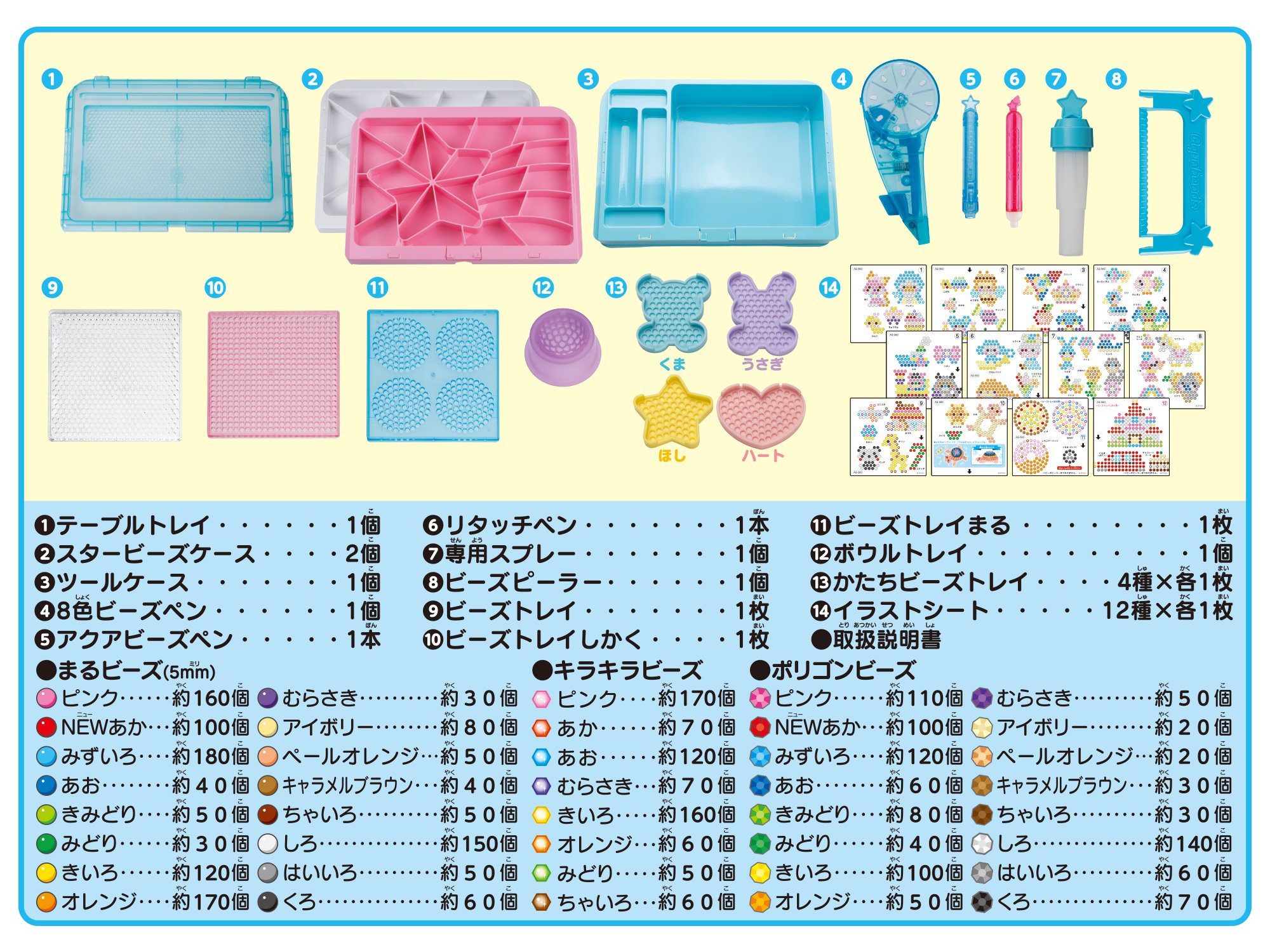 There are 8 types of bead tray, 3 types of pen, 12 illustrations sheets and it is a very satisfying set.