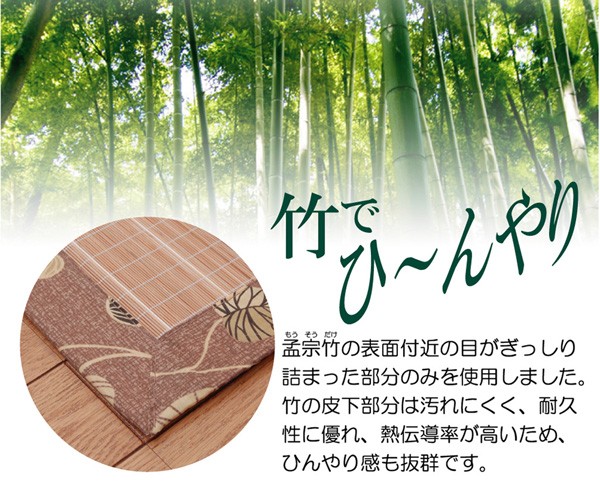 孟宗竹の表面付近の目がぎっしり詰まった部分のみを使用しました。表面部分は汚れにくく、耐久性に優れ、熱伝導率が高いため、ひんやり感も抜群です。1.4mmの細ヒゴを使用しています。竹を細ヒゴにする事で硬いイメージのある竹がやわらかく、しなやかになります。裏には不織布を貼っていますので、フローリングでのご使用に適しています。竹は他の木材と比べると、格段に成長が早く(3~5年で成竹)、持続的生産が可能な環境に優しいサスティナブルな素材です。