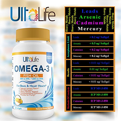 -. Feature : YOUR HEART HEALTH IS IMPORTANT -- UltaLife's Omega-3 Supplements with 1,500 mg Fish oil is rich in two essential Omega-3 Fatty Acids, 800mg EPA (eicosapentaenoic acid) and 600mg DHA (docosahexaenoic acid) which are recognized for their benefits in supporting cardiovascular health, lowering LDL (bad cholesterol) and triglyceride levels, increasing HDL (good cholesterol) and supporting normal blood pressure levels. / STRONG AND FLEXIBLE FOR US & OUR FURRY FRIENDS -- Omega 3 Fish Oil Supplements work to improve circulation and reduce inflammation. You'll notice increased Joint Strength & Flexibility when consistently taking Omega 3 Fatty Acids found in Fish Oil. Works great for dogs! Every dog will benefit from fish oil for their skin, coat and overall health. However, as dogs age they experience stiff joints and pain that can be greatly reduced or avoided by adding Omega 3 Fish Oil to their daily diets. / GIVES YOUR BRAIN A BOOST -- Omega 3 Fish Oil Supports Healthy Brain Function along with a Calming Effect, Improved Clear Thinking and Reduced Brain Fog. Omega 3's are a powerful immune system booster, too! / WE PROMISE NO NASTY TASTE AND NO BURPING! UltaLife Natural Omega 3 Supplements are 100% Satisfaction Guaranteed with a pleasant lemon flavor and NO Fishy Aftertaste. Our premium fish oil is heavy metals tested and refined through a specialized distillation process for purity. And they're totally burpless. / ADD TO CART NOW - Try UltaLife Omega 3 for yourself with total confidence because it comes backed by our 100% Satisfaction, "It Works-- Or Your Money Back" GUARANTEE. Click Add to Cart and BUY NOW
