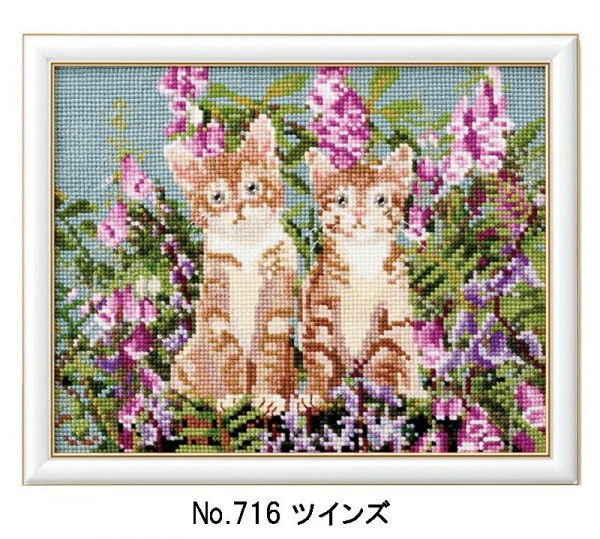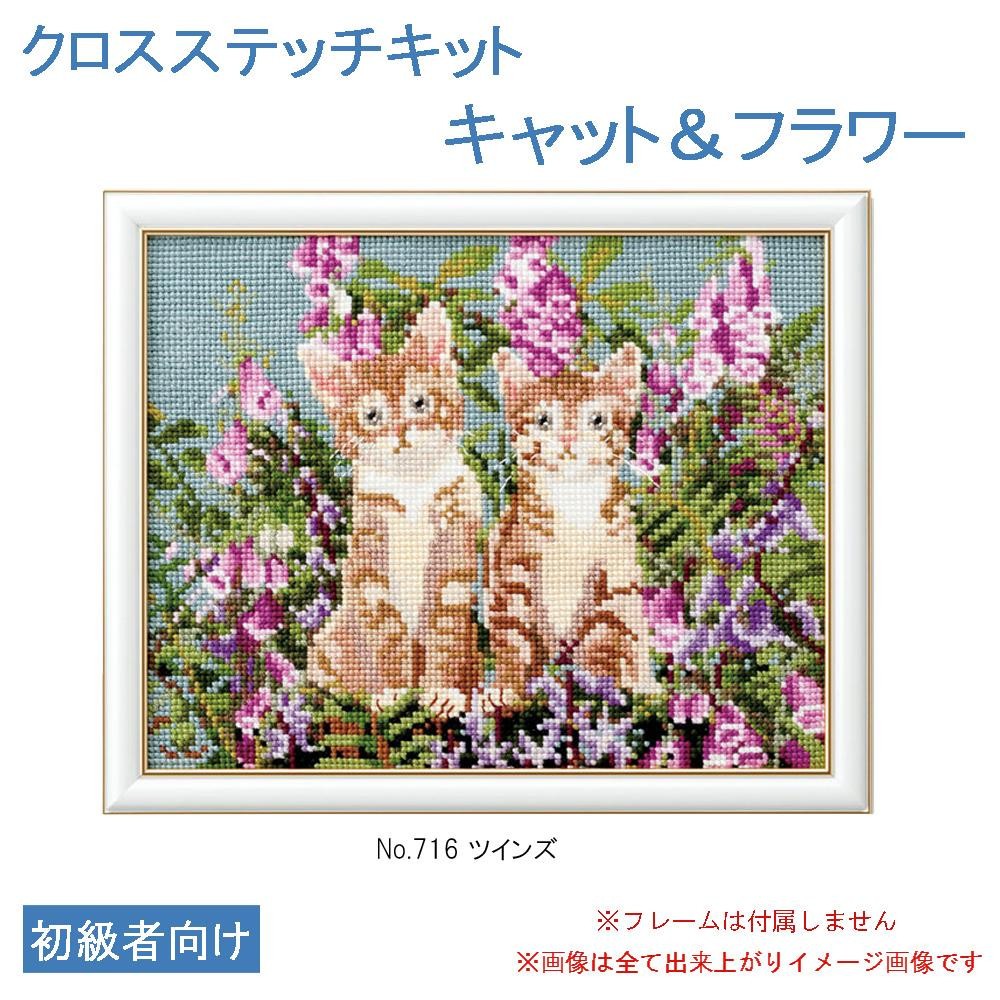 | 愛らしい子猫たちと花の情景をクロスステッチで描いたキットです。リビングや玄関に飾って、キュートなインテリアとして楽しめます。 |