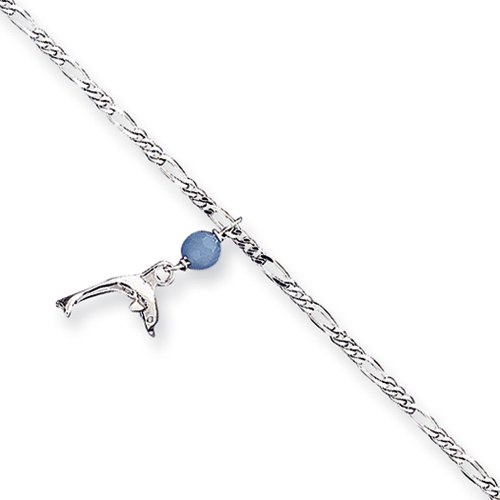 Looking for a fun way to show off your long sexy legs, try a graceful dolphin anklet that is sure to draw attention. This 16mm long sterling silver charm accented with a 4mm blue quartz bead dangles from a 2mm width 10-inch long sterling silver figaro chain. A spring ring clasp keeps this delightful bracelet securely fastened.Feature