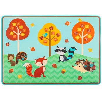 -. Feature : Woodland Animals Fall Placemat / Features Woodland Animals: Fox, Squirrel, Raccoon and Hedge Hog with Colorful Fall Trees / Placemat Measures 11 7/8" x 17, Food Safe, Wipe Clean / Fall Color Scheme, Mint Green, Turquoise, Brown, Orange with Chevron and Paisley Accents