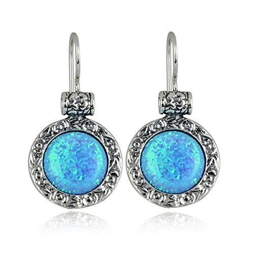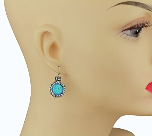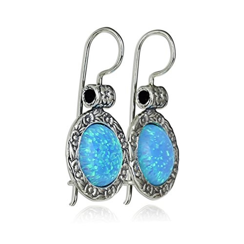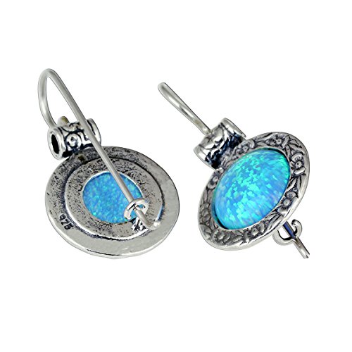 Impressive ornate 925 Sterling Silver earrings with created blue fire Opal and wire and hook closure.