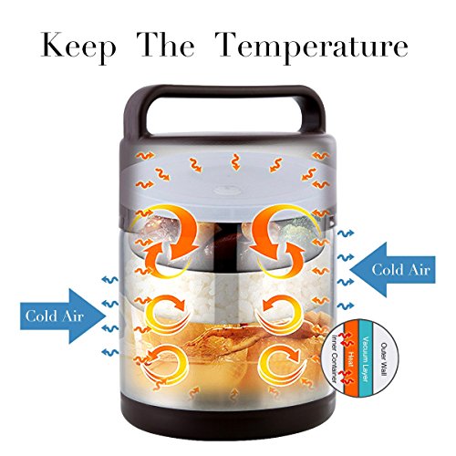Material: 304 food graded stainless steel interior and exterior is durable and withstands the demands of daily use; the double wall design allows this food jar to stay cool to the touch with warm foods and sweat-proof with cold foods