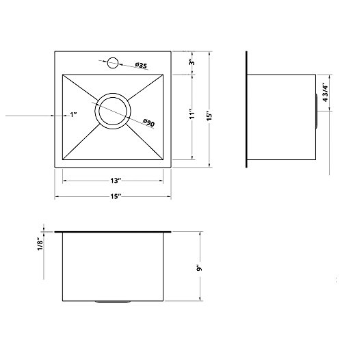 Exterior dimensions: 15" (wide) x 15" (front-to-back) | Interior dimensions: 13" (wide) x 11" (front-to-back) x 9" (bowl depth) | Standard 3.5" drain opening will fit any garbage disposal unit