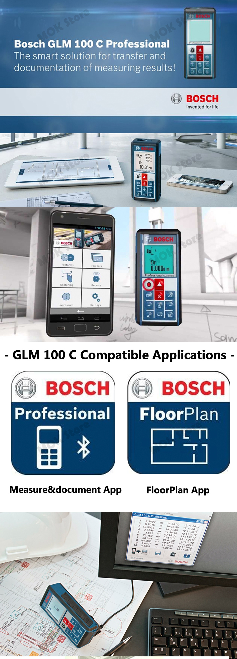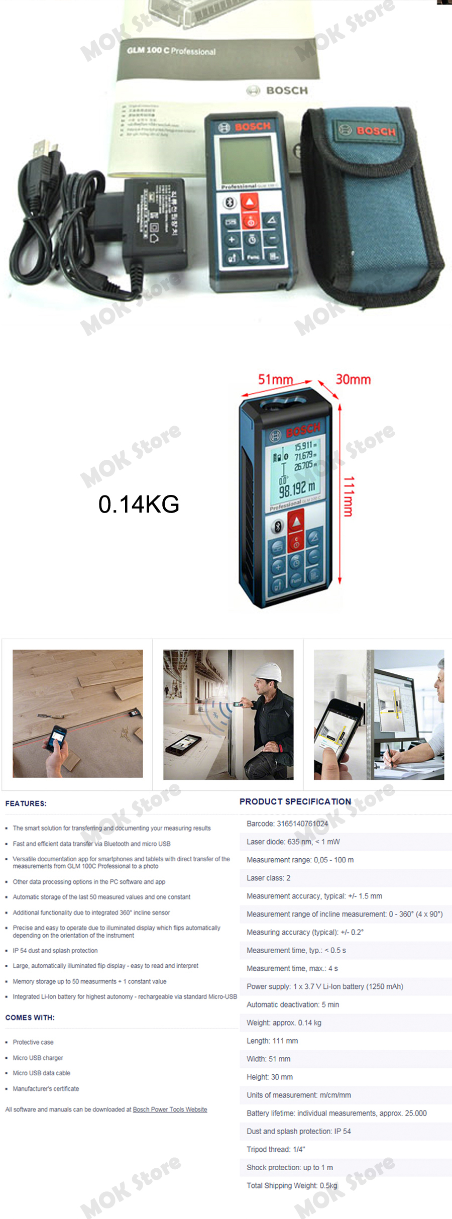 - Measurable range: 0.05-100m / Pythagoras inclination of measurement: -60 ~ + 60 ° / tilt measurement: 0 ~ 360 °