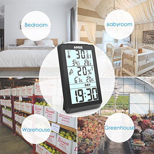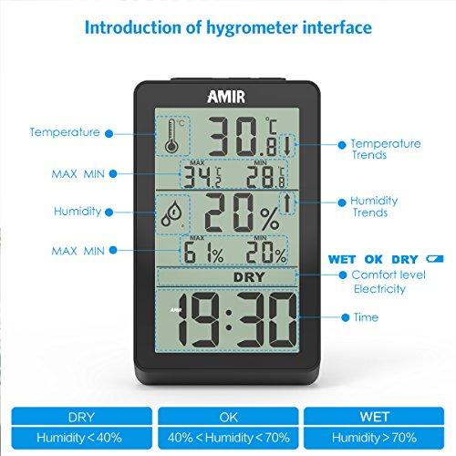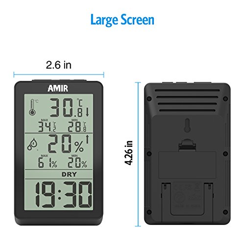 -. Feature : 【見やすい】小さいデジタル温湿度計 持ち運びに便利、邪魔にならないコンパクトサイズ 外出先でも気軽に測定が可能で日常生活での熱中症予防ができる 大きな文字で表示が見やすい / 【温度計&湿度計】温度と湿度のみの表示される温度湿度計です。最高及び最低温度湿度の記憶機能もあります。温室、ベビールームや他の温度および湿度に敏感な環境で適切な室内の状況を維持するに役立ちます。 / 【液晶画面】液晶画面とデジタル表示で、少し離れたところからでもはっきりとすうじが見えます。DRY・WET・COMFORTの快適表示表示機能付き、熱中症対策などに役立つだし、パッと見ても室内の状態がわかります。それとも、加湿器と除湿機のための完璧なコンパニオンです。 / 【精度】温度精度:±1℃ 湿度精度: ±5% 研発段階のサンプルは必ず地方の計量局へ温度湿度のテストに送ったり、量産品も工場にある恒温恒湿マシンで実測したりします。その為、精度といえば自信があります。室内用の温湿度計なので、もし室外に使用するのであれば、数値が多少ズレがあります。ご注意ください。 / 【AMIRの品質保証】:ご購入日から、一年間の保証サービスを提供します。万が一、初期不良などが御座いましたら、ご遠慮なくお問い合わせください。amirjp1@foxmail.com