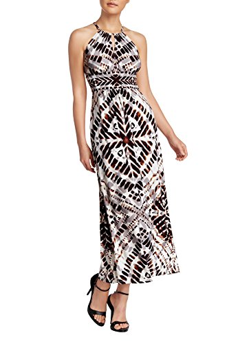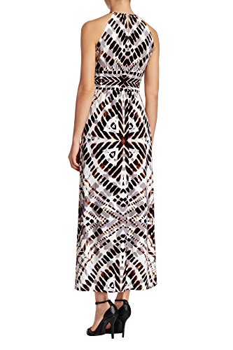 A stunningly bold printed matte jersey halter maxi dress. This London Times dress is magnificent. The intricate multi colored wood stamp print enhances this Halter Neck Maxi Dress. Polyester spandex blend fabrication makes it super comfortable to wear . Semi-fitted silhouette with allover pattern.Beautiful keyhole detail at neckline. The bold prints adds a dramatic flair. An incredibly versatile style!Feature