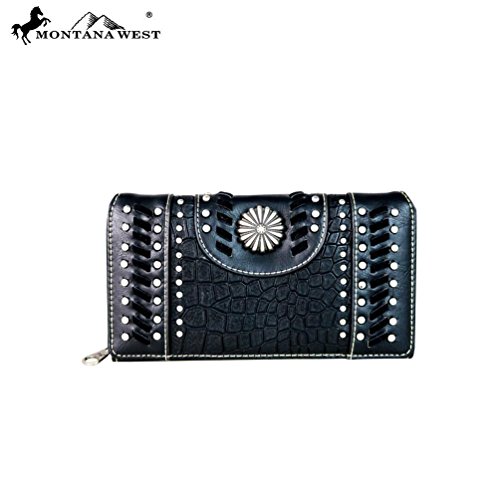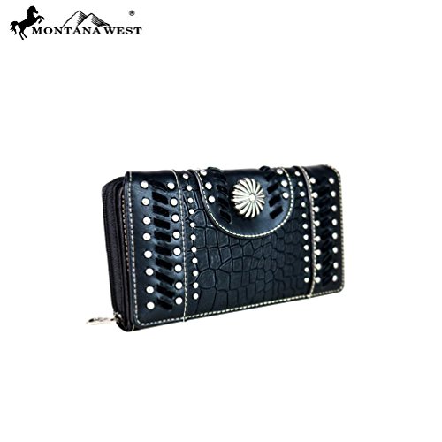 Product Description The Montana West wallet is made of PU leather, this western secretary wallet style has: Croc print. Accented with silver concho and stud. Saddle stitch detail. Single removable strap to convert the wallet into a wrislet A zippered pocket on the back. Pocket on the inside for ID,credit cards,cash and more. The wallet size is 7.25" x 1" x 4". 0