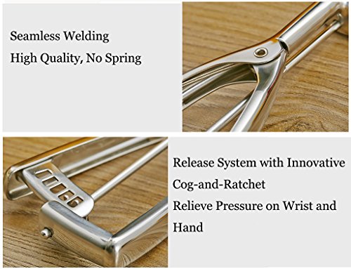 ● WITH ERGONOMIC TRIGGER, EASY TO USE - Due to the newly designed release system with innovative cog-and-ratchet, H-Min ice cream scoop with trigger would perfectly relieve pressure on your wrist and hand when you use it. With thoughtfully designed handles and ergonomic release system (no spring), we would use the ice cream scoop set easily and gently squeeze to release, without great effort. You can use them comfortable in the right or left hand.