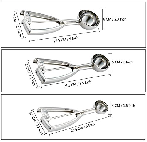 ● 3 THREE DIFFERENT SIZE, MEET DIFFERENT NEEDS – The ice cream scoop set includes three sizes, small size (scoop diameter: 1.6 inch/4 cm), medium size (scoop diameter: 2 inch/5 cm),large size (scoop diameter: 2.4 inch/6 cm). We can use different size scooper for large or small ice-cream, sorbet, fruit, meatballs, cookies, cupcakes, muffins.