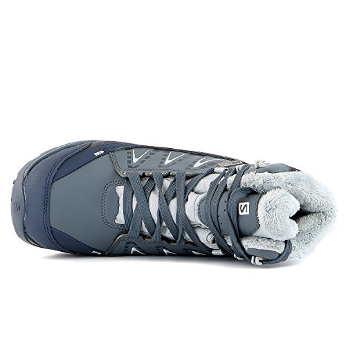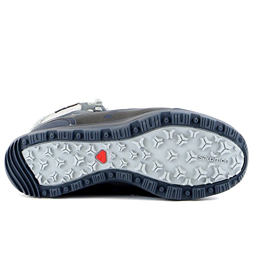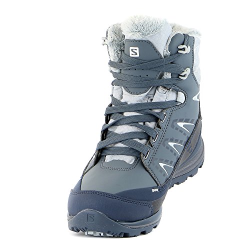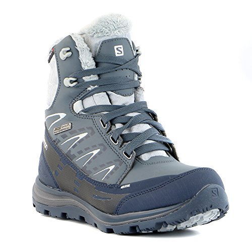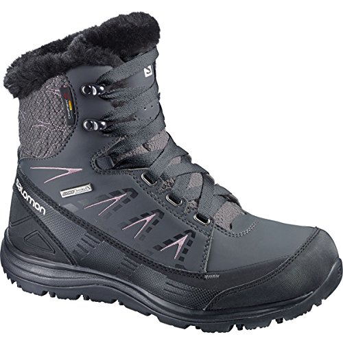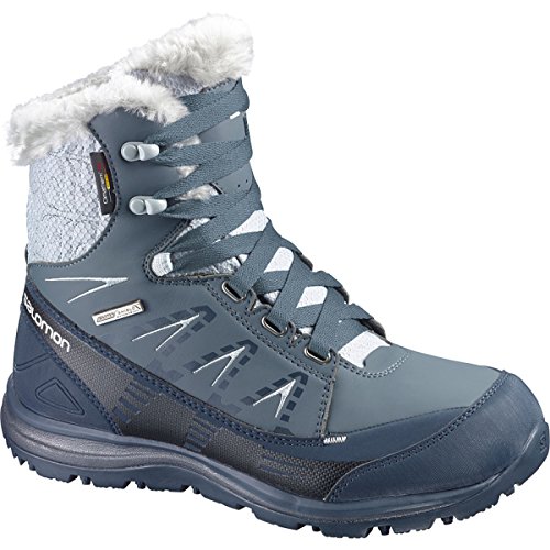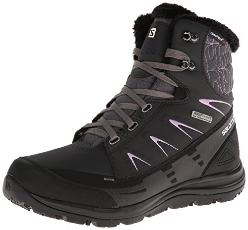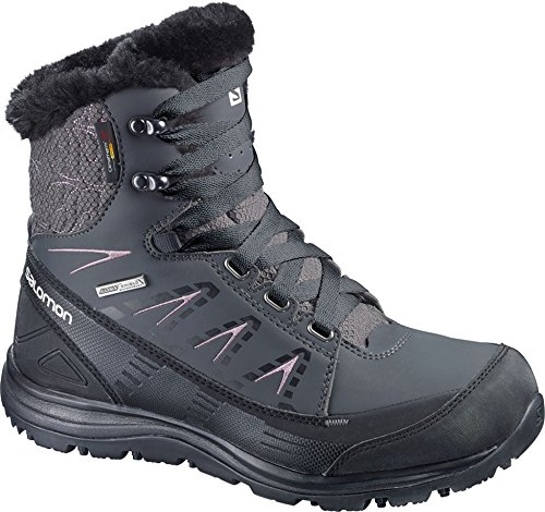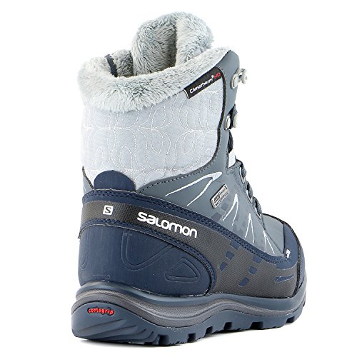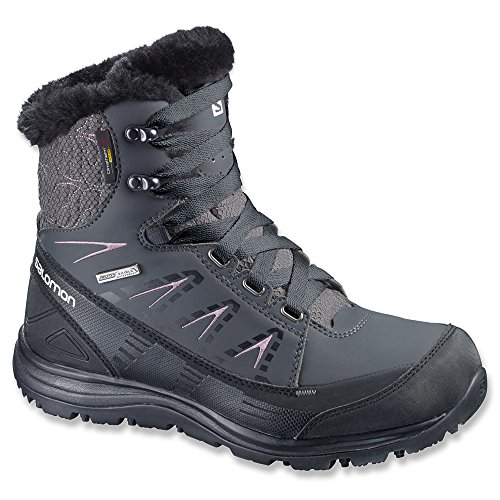 FEATURES of the Salomon Women's Kaina Mid CS WP Boot Mud guard Protective synthetic toe cap Heel foam Women's specific design Gusseted tongue Ice grip rubber compound Non marking winter contagrip Molded EVA midsole Injected EVA midsole Die cut EVA sockliner Climatherm HD insulation temperature Climashield waterproof membrane Textile lining Waterproof bootie construction