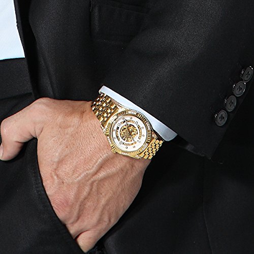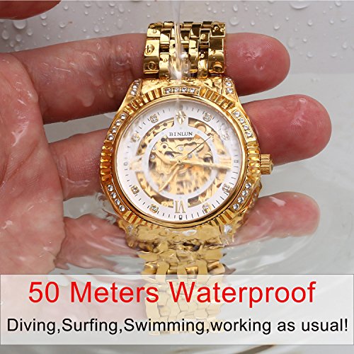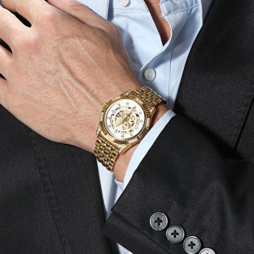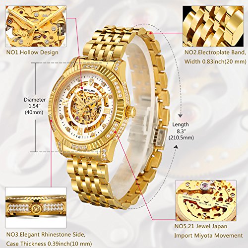 -. Feature : Miyota watch movement, Japan imported, 21 jewel, Automatic luxury watches for mens. / Synthetic sapphire face, scratch resistant display. Stainless steel case, 18K gold plated, fashion style. / Water resistant to 50 meters underwater, you can wear it when you diving, surfing, swimming. / The hollow dial design, elegant rhinestone, luxury temperament. It's a best gift to your friends, family and husband / Specification-case thickness: 0.39in (10mm), case diameter:1.54in (40mm), band width: 0.83in (21mm), valid band diameter:8.67in (22cm). Attention: if you got a big hand, you'd better measure the wrist diameter to see the band would match before making the order. If it didn't, then you can leave the message, we can make it extra-long fit your size