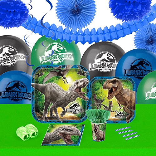 -. Feature : Jurassic World 16 Guest Tableware & Deco Kit includes 16 dinner plates, dessert plates, cups, forks, spoons, 20 lunch nakpins, 2 solid table clothes, 12 latex balloons, 2 curling ribbons, 1 decoration kit, 1 box of 24 candles. / Add additional party tableware, decorations, favors, games, and activities to complete your celebration and entertain your guests. / Great for childrens birthday parties, kids school parties, a pizza party, or a theme party. / Perfect for fans of Jurassica Park, Jurassic World, dinosaurs, or prehistoric animals.