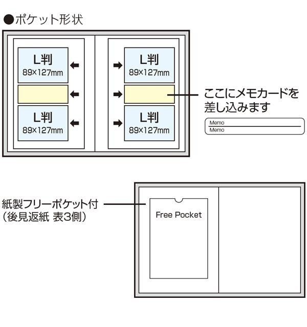 | 仕様 | ■印刷ポリプロピレン貼表紙 ■台紙:紙製L判2段ポケットポイントシール台紙×40枚 ■写真収納枚数:L判160枚 ■背丸ブック式製本 ■フリーポケット付 |