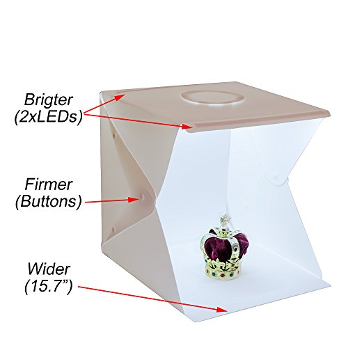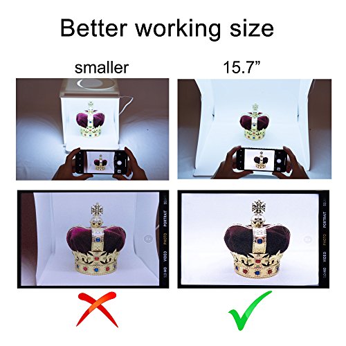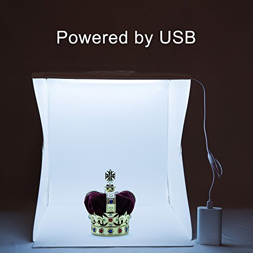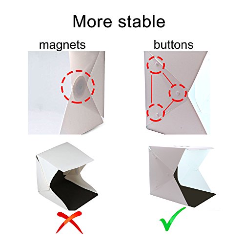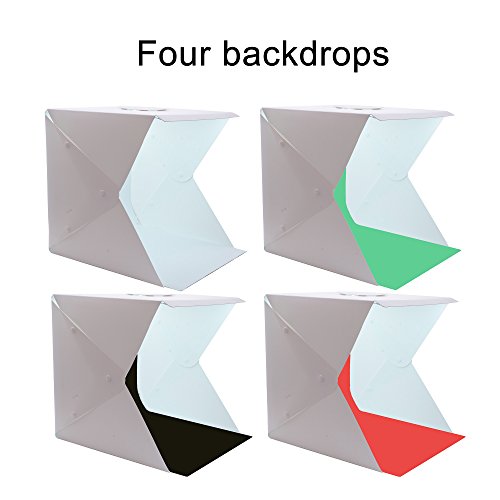 This portable light box is the perfect partner for hobbyists, collectors, and online sellers to photograph stuffs with medium or small sizes, such as jewelries, watches, flower, fruits, cookies, cupcake. It can be carried everywhere and save space when it is folded. - Features - Brighter lighting (include 2 bright white LED light strips) Better working size (size is 15.7x15.7x15.7") More stable build (use 3-button design) More backdrops provided (include 4 colors: white, black, green and red) Lightweight, portable, and easy to install (thickness after folding is 1 inch / 26mm). Removable circle cover on the top of studio box, for high angle shot Powered by USB: simply plug to a pc, laptop, or power bank. - Technical Specifications - LED Bead: 35pcs x 2 Bead lumens: 24lm x 35 x 2=168lm Input voltage: 5V 2A Color temperature :5500K Weight: 1.2kg Open product Size: 15.7x15.7x15.7 inch / 40x40x40cm Thickness after folding: 1 inch / 2.6cm Power interface: Micro USB Photo Light Box Material: Studio(environment plastic)/ background backdrop(EVA) - Package Content - 1 x light box 1 x USB cable 4 x four background cloths 1 x storage bag 0 |