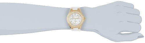 -. Feature : Japanese quartz movement / Flame-fusion crystal; brushed and polished 18k gold ion-plated stainless steel case; white patterned silicone strap / 60 second, day and date silver tone subdials / White dial with gold tone hands and arabic numerals; white crystal accents on bezel / Water resistant to 99 feet (30 M): withstands rain and splashes of water, but not showering or submersion