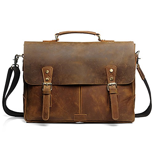 -. Feature : PREMIUM MATERIAL CONSTRUCTION: Superior cowhide crazy horse leather,handcrafted by artisans working with leather for decades to ensure long lasting durability / DRUABLE HANDLES-Carrying handle made of the same cowhide and fixed by high quality hardware, which brings comfortable feeling and makes the bag durable / EASY TO CARRY- Dimension of the bag is about 12.2(H)*16.1L)*4.3(W)inch. designed to carry most 15.6 inch laptop computers / VARIOUS POCKETS - Besides the main storage compartment, featured on the messenger bag are 2 larger front pockets for easy access of frequently handled items, 1 zipper pocket for significant articles such as wallets and identification documents, and 2 Inner wall pockets to store cellphones, chargers, one back zipper pocket / WEARABILITY - The messenger bag features a wide shoulder strap that eliminates shoulder fatigue. The shoulder strap is removable and adjustable. The bag can be carried by the handle, worn on shoulders, and positioned across body